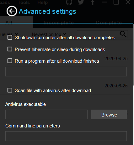 Video download,clipboard monitoring, automatic antivirus checking,scheduler, system shutdown on download completion.